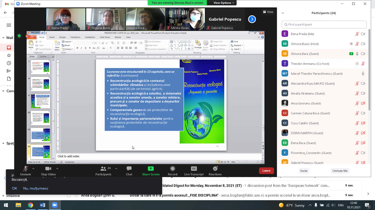 In cadrul Targului de Carte Gaudeamus Radio Romania, editia nr. 28, a avut loc lansarea on line a cartii Reconstructie ecologica. Argumente si provocari, autori Gabriel Popescu, Simona Bara si Elena Preda, aparuta la Editura ASE in anul 2021.