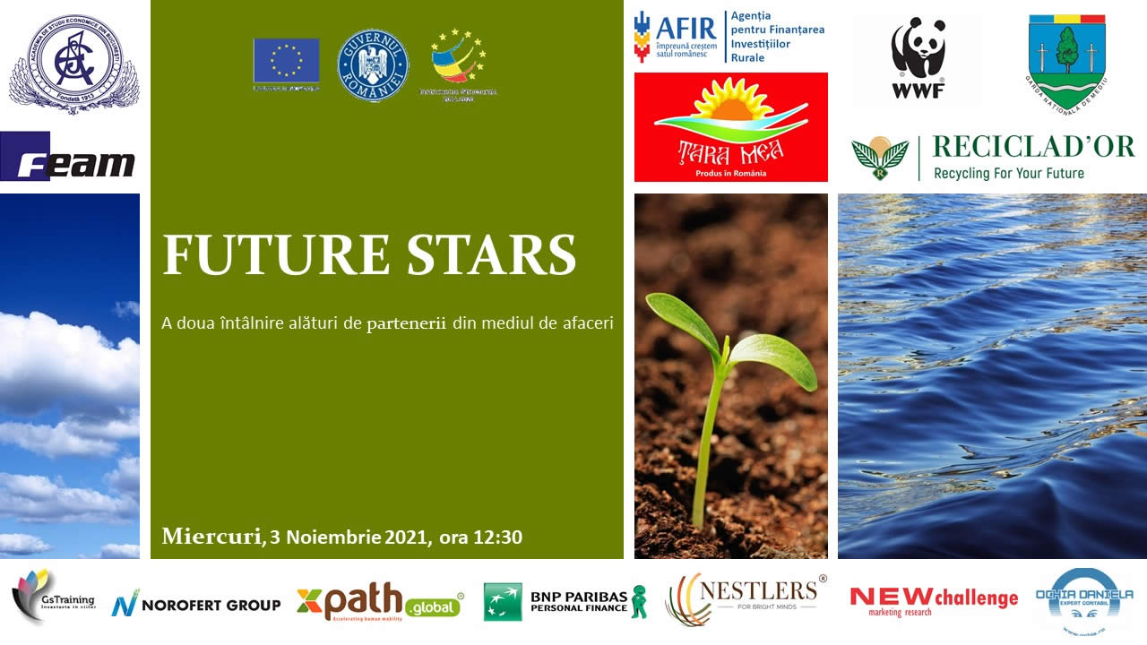 Facultatea de Economie Agroalimentară și a Mediului organizează luni, 19.04.2021, la ora 17.30, în cadrul proiectului „Future Stars - parteneriat sustenabil pentru practica studenților”, prima întâlnire alături de partenerii din mediul de afaceri